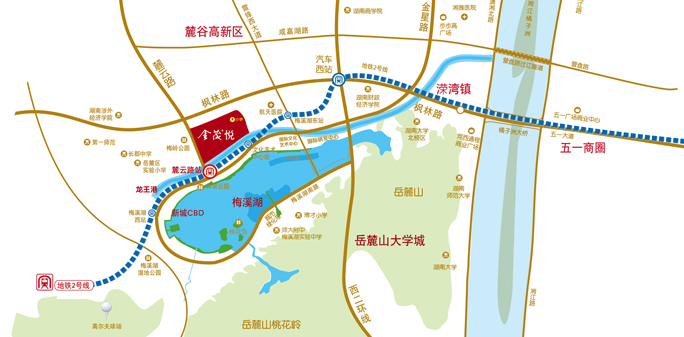 梅溪湖北岸区域设置地铁出入口4个重要站点,“二环七射一联”,干线纵横四通八达,十分钟连接湖南省最大交通枢纽中心——大河西先导区综合交通枢纽,三维立体交通无缝换乘,确保北岸作为未来新城核心的发展潜力和交通扩容性。 梅溪湖•金茂悦,距离地铁2号线麓云路站仅50米,是梅溪湖北岸仅有的4个地铁口物业之一,地铁开通后,将形成独特的地铁“生活圈”和地铁文化,极大提升周边物业价值。
